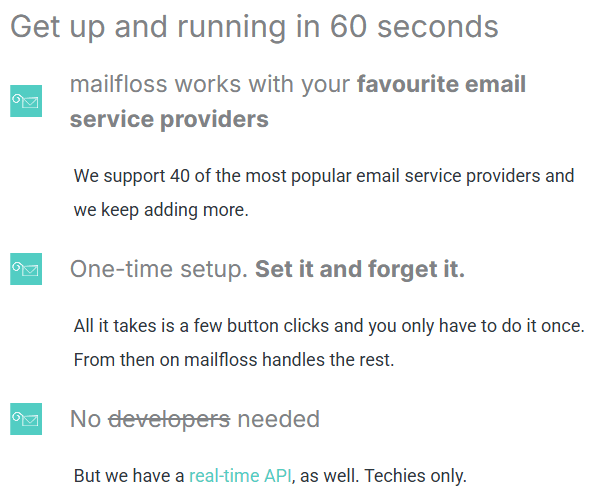 What sets mailfloss apart from enterprise-focused tools like ZeroBounce or NeverBounce is both its automation and its audience fit. As the documentation explains: "Other services, even those that integrate with Infusionsoft, Mailchimp, or other email service providers, still require you to remember to use them, go through the results, decide what to do."